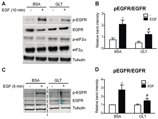 Glucolipotoxicity impairs EGFR activation in beta cells and human islets. Human islets and 832/13 cells were cultured in media with 5 mM glucose and BSA, or 25 mM glucose and 400 μM palmitic acid complexed to BSA (glucolipotoxicity, GLT) for 48 or 8 h, respectively, followed by starvation in 5 mM glucose medium for 2 h, and then stimulated with recombinant human EGF (50 ng/mL for 10 min for islets and 10 ng/mL for 5 min for cells). Protein levels of p-EGFR, EGFR, p-eIF2α, and tubulin were analyzed by immunoblotting. Shown are representative immunoblots from human islets (A,B) and 832/13 cells (C,D), and quantified data are reported as fold induction relative to BSA, non-stimulated samples. Groups were compared using ANOVA with Bonferroni post hoc tests. n = 3 independent human islet preparations and 3 independent cell line experiments; * p < 0.05 vs. BSA, non-stimulated; # p < 0.05 vs. BSA, EGF-stimulated.