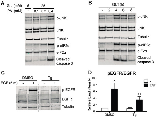 ER stress impairs EGFR phosphorylation. (A) To verify induction of ER stress, 832/13 cells were cultured in media containing 5 mM glucose and BSA or 25 mM glucose and increasing concentrations of palmitic acid complexed to BSA (0, 0.1, 0.2, or 0.4 mM) for 8 h. (B) In a complementary experiment, cells were exposed to 25 mM glucose and 0.4 mM palmitic acid for up to 8 h. Cells were harvested, and lysates were immunoblotted using antibodies directed against p-JNK, JNK, p-eIF2α, eIF2α, and cleaved caspase 3 to establish the extent of ER stress produced by glucolipotoxicity. Shown are representative, confirmatory immunoblots. (C) To induce ER stress, 832/13 cells were treated with DMSO (vehicle control) or 1 μM thapsigargin (Tg) for 4 h, followed by starvation and EGF stimulation as before. Protein levels of p-EGFR, EGFR, and tubulin were analyzed by immunoblotting. Representative blots of n ≥ 3 experiments are shown, and results are quantified in (D). Groups were compared using ANOVA with Bonferroni post hoc tests. * p < 0.05 vs. BSA, non-stimulated; # p < 0.05 vs. BSA, EGF-stimulated.).
