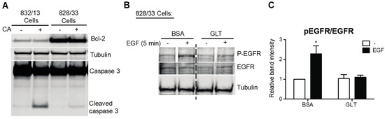 Apoptosis is not required for glucolipotoxicity-impaired EGFR activation. (A) To promote apoptosis, 832/13 and Bcl-2 overexpressing 828/33 cells were treated with 1 μM camptothecin (CA) for 8 h. To demonstrate resistance to cell death in 828/33 cells, protein levels of Bcl-2, full-length and cleaved caspase 3, and tubulin were analyzed by immunoblotting. (B) A total of 828/33 cells were cultured in media, as in Figure 1. Protein levels of p-EGFR, EGFR, and tubulin were analyzed by immunoblotting, and quantified results are reported in (C). Groups were compared using ANOVA with Bonferroni post hoc tests. n = 3; * p < 0.05 vs. all other groups.