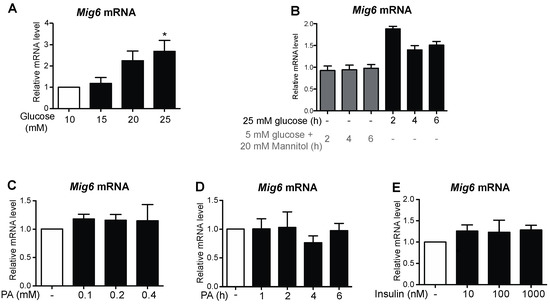 Gluco-, but not lipotoxicity, alone induces Mig6 expression. 832/13 cells were treated with (A) 5, 10, 15, 20, or 25 mM glucose for 4 h, (B) 25 mM glucose or 5 mM glucose + 20 mM mannitol (as an osmotic stress control) for 0, 2, 4, or 6 h. (C) BSA, 100, 200, 400 μM palmitic acid complexed to BSA for 4 h. (D) A total of 400 μM palmitic acid for the indicated times, or (E) 0, 10, 100, or 1000 nM recombinant human insulin for 4 h. Mig6 mRNA levels were determined by qRT-PCR. Groups were compared using ANOVA. n ≥ 3 experiments. * p < 0.05 vs. BSA/5 mM glucose + 20 mM mannitol.