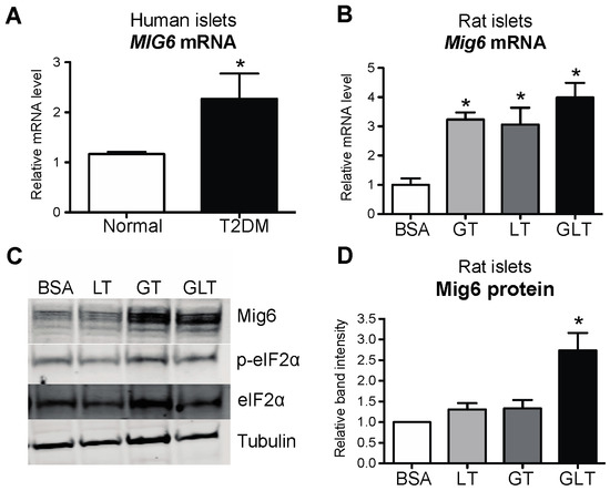 Mig6 is elevated in T2DM human and rodent islets treated with glucolipotoxicity. (A) MIG6 mRNA was measured in human islets from normal (white bar) and type 2 diabetic (black bar) cadaver donors. (B) Rat islets were cultured in media containing 5 mM glucose and BSA (white bar), 25 mM glucose and BSA (glucotoxicity, GT; light gray bar), 5 mM glucose and 0.4 mM palmitic acid complexed to BSA (lipotoxicity, LT; dark gray bar), or 25 mM glucose and 0.4 mM palmitic acid (glucolipotoxicity, GLT; black bar) for 8 h. Mig6 mRNA was measured by RT-PCR. (C) Rat islet lysates were immunoblotted with antibodies directed against Mig6, p-eIF2α, eIF2α, and tubulin, and (D) results for Mig6 content were quantified. Groups were compared using ANOVA with Bonferroni post hoc tests. N = 3–4; * p < 0.05 vs. normal or 5 mM glucose with BSA.