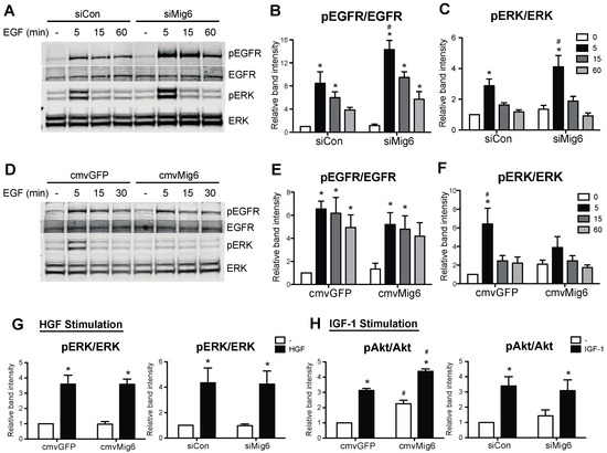 Mig6 controls EGF, but neither IGF1 nor HGF, pro-survival signaling pathways. (A–F) 832/13 cells were transduced with adenoviruses carrying cmvGFP vs. cmvMig6 or siCon vs. siMig6. Post transduction, cells were starved in 5 mM glucose and 0.1% BSA medium for 2 h, followed by 10 ng/mL recombinant rat EGF stimulation for 5 min. (G,H) After adenoviral transduction and starvation as in ((A,D), 832/13 cells were treated with recombinant human HGF or IGF-1 for 5 min. Protein levels of p-EGFR, p-Erk, Erk, p-Akt, Akt, and tubulin were analyzed by immunoblotting. Groups were compared using ANOVA with Bonferroni post hoc tests. n ≥ 3. * p < 0.05 vs. non-stimulated. # p < 0.05 vs. control virus, stimulated condition.