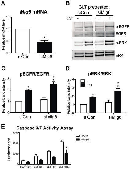 Mig6 suppression dampens apoptosis during glucolipotoxicity. (A) 832/13 cells were transduced with adenoviral vectors carrying either a scrambled control siRNA (siCon) or shRNA sequence against Mig6 (siMig6). Mig6 mRNA levels were determined by qRT-PCR. Groups were compared using Student’s t-test. n = 4; * p < 0.05. (B–D) Transduced cells were treated with GLT and EGF, as described previously. Protein levels of p-EGFR, EGFR, p-Erk, and Erk were determined by immunoblotting. Data are reported as fold induction related to the GLT-treated, non-EGF-stimulated group. Groups were compared using ANOVA with Bonferroni post hoc tests. n ≥ 3. * p < 0.05 vs. EGF-treated. # p < 0.05 vs. siCon EGF-stimulated. (E) Caspase 3/7 activity was measured following exposure to glucolipotoxic conditions in 832/13 cells siCon or siMig6. Groups were compared using ANOVA with Bonferroni post hoc tests. n = 3 experiments; * p < 0.05 vs. siCon.