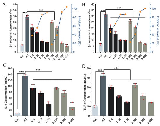Both curcumin and EGCG inhibit IgE-mediated degranulation in the RBL-2H3 cell model. (A,B) exhibit β-hexosaminidase release at 1 h and 3 h, respectively. The β-hexosaminidase release (%) is represented by each column, and the line reveals the inhibition of release (%). (C) IL-4 release at 3 h. (D) TNF-α release at 3 h. All data are presented as the mean ± SD. Individuals in each group are represented by the red dot in each column. C5, C10, C30, and C50 denote intervention groups in which IgE/antigen-stimulated cells were treated with 5, 10, 30 and 50 μM curcumin; E100, E200, E500, and E650 denote intervention groups in which IgE/antigen-stimulated cells were treated with 100, 200, 500, and 650 μM EGCG. ***: p < 0.001.