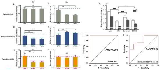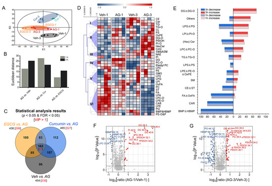 Global profiling of the cellular lipidome was visualized by unsupervised PCA. Two types of metabolic disturbance, time-related and treatment-induced changes, were clearly visible on the score plot (Figure 3A). Cell specimens collected at 1 h and 3 h were presented on the two sides of the PCA score plot. The control (i.e., Veh and AG) and different intervention groups (i.e., Cur and EGCG) showed a clear trend of discrimination along the second principal component. An overview of these lipidome differences was further quantified by analyzing the Euclidean distance between the AG group and other groups at each time point (Figure 3B).