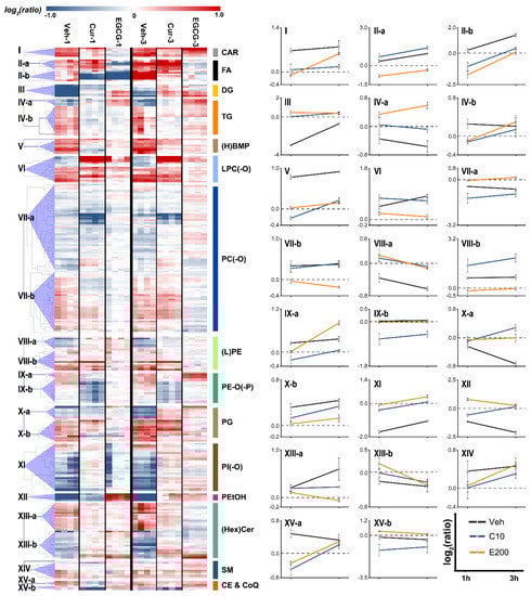 Comparison between curcumin and EGCG intervention. Representative differential lipids associated with allergen stimulation were subjected to heatmap to specify the regulation by curcumin/EGCG. The conversion dataset with relative contents of lipids (i.e., the contents of lipids for each sample divided by the average values from time-matched AG individuals) was logarithmically scaled, and then categorized in the tree of hierarchical clustering analysis based on the similarity of the regulation-response pattern (left panel). Representative metabolites were selected from each cluster to present the response trajectory (right panel). Each point in the trajectory was presented as the average relative content ± SD.
