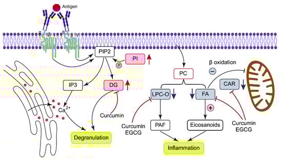 Certainly, these lipidome changes might be the result of the development of protein–polyphenol complexes with possibly lower allergenic potential [5,6], as well as more sophisticated and comprehensive anti-allergy mechanisms. Following that, a growing number of studies have demonstrated that mast cell synthesis and metabolism of lipid mediators, in turn, influence cellular processes [9,11]. The role of lipids in the pathogenesis of allergic disease has long been studied. Our study indicated that a potency was observed with curcumin than with EGCG in the disturbance of lipid metabolism, in accordance with the superior effects of curcumin observed when compared with EGCG in the suppression of the degranulation process. A considerable similarity between curcumin intervention and EGCG was discovered in their lipidome remodeling patterns. Our study confirmed the significance of DG, FA, BMP, and LPC metabolism for IgE/antigen stimulation and subsequent curcumin/EGCG intervention. Both changes in lipid response and composition patterns indicated that lipids influence the degranulation process via multiple mechanisms, including (i) producing highly proinflammatory mediators, (ii) mediating intracellular signaling cascades by acting as second messengers, (iii) activating a diverse family of receptors, and (iv) forming structural support platforms (lipid rafts) and extracellular vesicles.