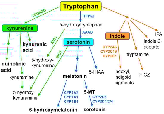 Tryptophan, an essential amino acid and a component of different proteins, is metabolized through three main metabolic pathways, namely the kynurenine, serotonin and indole pathways [9] (Figure 1). Tryptophan is not a direct substrate of cytochrome P450 in animals and humans, but it serves as a CYP substrate in plants. However, tryptophan-derived indole metabolites interact with different cytochrome P450 enzymes, yielding biologically active compounds. In addition, in some cytochrome P450 enzyme proteins, tryptophan plays a key role in enzyme survival, as shown for cytochrome P450BM3 (CYP102A1), a bacterial enzyme from Bacillus megaterium [10].