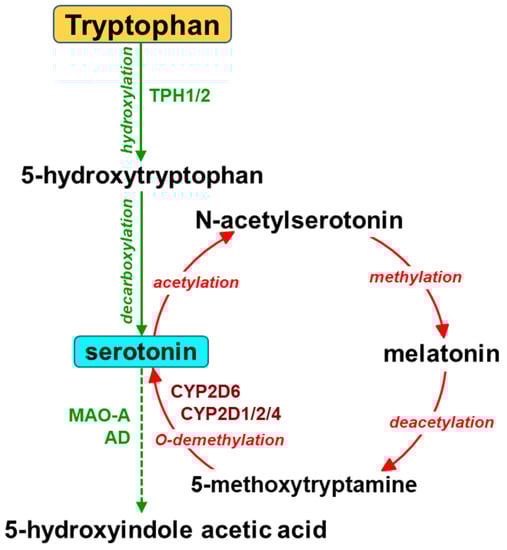 The engagement of cytochrome P450 in the synthesis of serotonin. AD = aldehyde dehydrogenase; MAO-A = monoamine oxidase A; TPH1/2 = tryptophan hydroxylase 1/2.