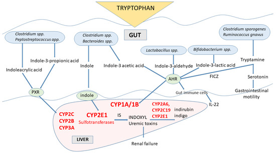 In gut microbes expressing different enzymes, tryptophan is metabolized to indole and indole derivatives [89] (Figure 4). Several bacterial species (e.g., Clostridinum species and Bacteroides species) directly convert tryptophan to indole by expressing the enzyme tryptophanase, while other microbes engage various enzymes to produce a number of tryptophan indole metabolites (e.g., Clostridium species, Peptostreptococcus species, Lactobacillus species, Bifidobacterium species). Some of those indole metabolites (tryptamine, skatole, indoleacetic acid, indolealdehyde, indoleacrylic acid, indolelactic acid) act as activators or inhibitors of aryl hydrocarbon receptor (AhR), a cytoplasmic transcription factor that was found in intestinal immune cells, in this way affecting CYP1A/1B subfamily expression and thus xenobiotic metabolism and regulating the IL-22 expression and immune responses [9,18,89]. Indole, indolepropionic acid and indoleacrylic acid influence mucosal homeostasis by decreasing intestinal permeability, possibly mediated by the pregnane X receptor (PXR, a nuclear transcription factor). PXR is one of the nuclear transcription factors engaged in the regulation of cytochrome P450 enzymes’ expression belonging to the subfamilies CYP2C, CYP2B and CYP3A [90]. Tryptophan metabolites migrate through the intestinal epithelium to the blood, where some (indolepropionic acid, indoleethanol, indoleacrylic acid) have antioxidant and anti-inflammatory properties.