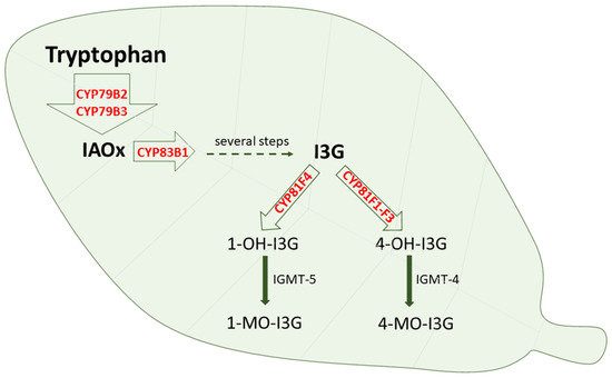 In the model plant Arabidopsis thalia, cytochrome P450 enzymes contribute to the catabolism of tryptophan, being engaged in many metabolic pathways [104]. Tryptophan is oxidized by CYP79B2 and CYP79B3 to indole-3-acetaldoxime (IAOx). The transcription factors MYB34, MYB51 and MYB122 are regulators of CYP79B2 and CYP79B3 genes, and thus tryptophan metabolism [105]. IAOx is further metabolized by CYP71A12 and CYP1A13 to indole-3-acetonitrile (IAN), and then by CYP71B15 to camalexin. IAN can also be transformed with the participation of CYP71B6 to indole-3-carboxylic acid. Both CYP71A12 and CYP71A13 play an important role in the resistance of Arabidopsis thalia against the selected filamentous pathogens Plectospharella cucumerina and Colletotrichum tropicale; however, CYP71A12 is the major enzyme responsible for the accumulation of indole-3-carboxylic acid in response to pathogens [104]. On the other hand, IAOx is oxidized by CYP83B1 to indole-3-glucosinolates, which contribute to the resistance against Plectospharella cucumerina [105]. The abovementioned three secondary indole metabolites of tryptophan glucosinolates, camalexin and indole-3-carboxylic acid are produced by selected cytochromes P450 in response to microbial pathogens and are considered important components of the natural plant immune system.