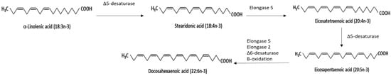 The metabolic conversion pathway of plant-derived ALA to bioactive EPA requires the help of Δ6-desaturase to form stearidonic acid, which then transforms to eicosatetraenoic acid via elongation, then to DHA by desaturation with the involvement of Δ5-desaturase. In humans, the metabolism is influenced by various factors (e.g., age, sex, hormonal change, genetics, etc.), the conversion rate can be relatively low, and the health benefits of ALA are limited [83]. Only around 8% of dietary ALA is converted to EPA and less than 4% to DHA in healthy young males, whereas in healthy young females, 21% of dietary ALA is converted to EPA and 9% to DHA [84,85]. Moreover, ALA has low bioavailability due to a higher rate of oxidation. In comparison, DHA has more bioavailability owing to its characteristic as a poor β-oxidation substrate [16]. Marine-derived EPA and DHA are considered better N3PUFA sources.