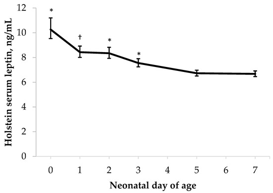 Effect of time on neonatal Holstein calf serum leptin concentration (p = 0.09). Means are reported with 95% confidence intervals. [* Denotes day is different than all subsequent days; † Denotes day is different from day 0, 3, 5, and 7].