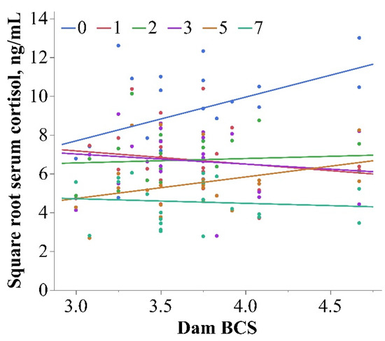 Interaction between dam BCS and time for neonatal serum cortisol in Holstein calves (p = 0.02; square root transformed). The d 0 serum cortisol was positively associated with dam BCS (blue line; p = 0.01; R2 = 0.20).