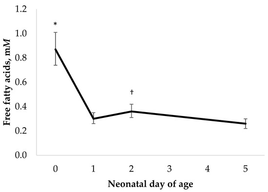 Effect of time on neonatal Holstein calf free fatty acid concentration (p = 0.01). Means are reported with 95% confidence intervals. [* Denotes that d 0 is different than all other days (p < 0.05); † Denotes a difference between day 2 and day 5 (p < 0.05)].