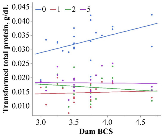 Interaction of dam BCS and time for neonatal serum total protein concentration in Holstein calves (p = 0.03; transformed 1/x2). The day 0 serum total protein was negatively associated with dam BCS (blue line; p < 0.01; R2 = 0.19).
