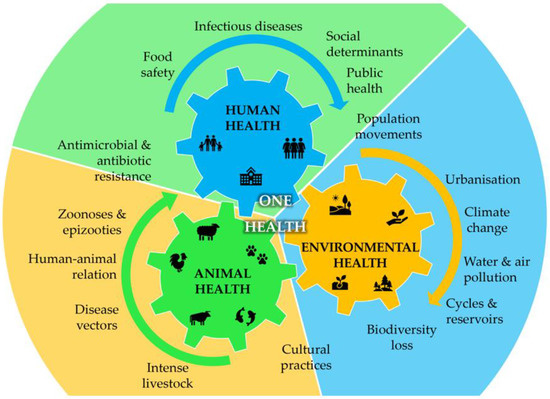 Integrated overview of the One Health concept showing the interdependence between human, animal, and environmental health and the interplay of the main factors that drive each one of the three categories (adapted from [7,8,9]).