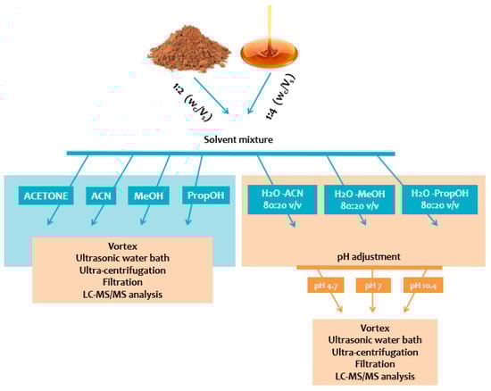- Deda, O.; Chatziioannou, A.C.; Fasoula, S.; Palachanis, D.; Raikos, N.; Theodoridis, G.A.; Gika, H.G. Sample Preparation Optimization in Fecal Metabolic Profiling. J. Chromatogr. B Analyt. Technol. Biomed. Life Sci. 2017, 1047, 115–123. [Google Scholar] [CrossRef]