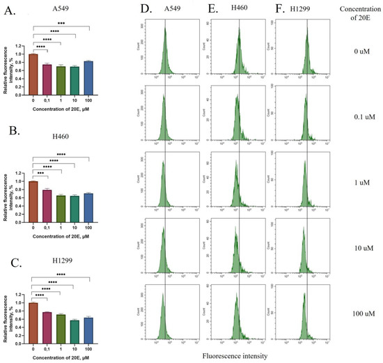 The 1.5 h treatment with 20E suppresses ROS in NSCLC cell lines. (A–C) Diagrams of relative DCDFA fluorescence for A549, H460, and H1299 cells treated with 0.1–100 µM of 20E. Y-axis shows the degree of fluorescence intensity of 20E treated cells relative to the fluorescence of control cells. (D–F) Flow cytometry plots for DCDFA fluorescence; ‘median’ of the peak for control sample is showed by vertical bar. *** p ≤ 0.001; **** p ≤ 0.0001.