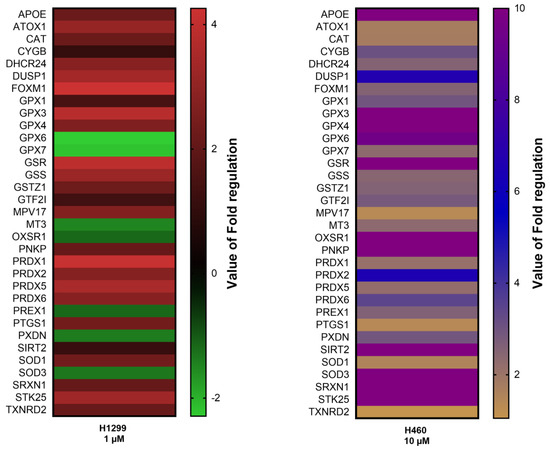 The heatmap showing the expression of genes associated with antioxidant response after the treatment of H1299 and H460 cells with 20E for 24 h (Qiagen RT² Profiler™ PCR Array Human Oxidative Stress kit). The Fold Regulations display a value of the normalized gene expression in 20E-treated cells divided by the normalized gene expression in the control (DMSO-treated) cells.