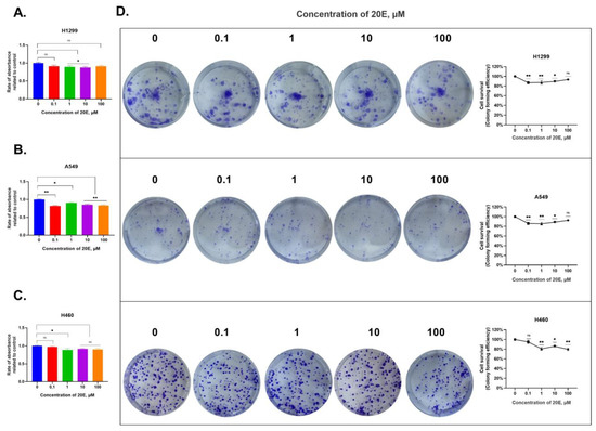 20E inhibits the growth of NSCLC cell lines. (A–C). MTT data for H1299, A549, and H460 cell lines. (D). Colony formation assay. * p ≤ 0.05; ** p ≤ 0.01, ns—not significant.