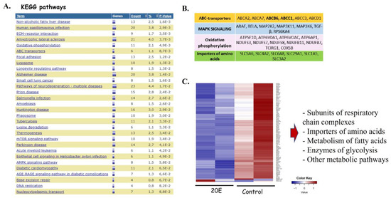 The analysis of differentially expressed genes showed that 20E may affect various processes in the cells (Figure 4A). All in all, we observed 619 down-regulated (Table S4) and 61 up-regulated (Table S5) genes.