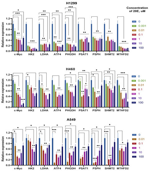 H460, A549, and H1299 cell lines are frequently used as widely accepted cell models in the context of the metabolic rewiring of NSCLC [41,42,43]. To study the impact of 20E on the expression of genes involved in glycolysis and one-carbon metabolism, H460, A549, and H1299 NSCLC cells were treated with the extended concentration range of 20E (0.01–100 µM) for 48 h. In addition to genes coding for metabolic enzymes, we also analyzed the expression of two transcription factors which are deemed to be critical regulators of glycolysis and one-carbon metabolism: c-Myc [44,45,46] and ATF4, respectively [47,48,49]. We analyzed two key glycolytic genes encoding for hexokinase 2 (HK2) and lactate dehydrogenase A (LDHA). Regarding one-carbon metabolism, we assessed the expression of genes coding for all three steps of serine biosynthesis—PSAT1, PSPH, and PHGDH—as well as key mitochondrial enzymes of the folate cycle: SHMT2 and MTHFD2.
