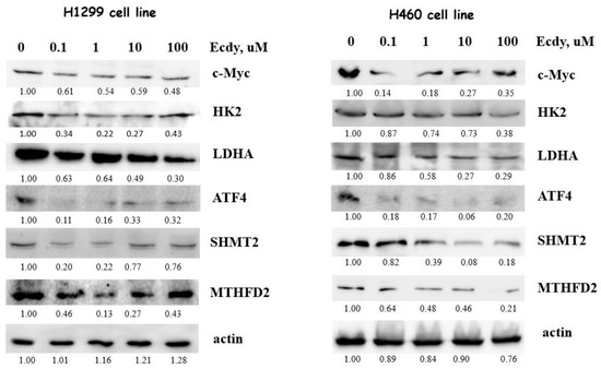 Next, we used immunoblotting to assess the influence of 20E on the protein level of both the studied enzymes and their key regulators. For this purpose, we incubated H1299 and H460 cell lines with 0.1–100 µM of 20E for 3 days. Western-blot results confirmed the Real-time PCR data. As seen from Figure 6, 20E significantly suppressed HK2, LDHA, SHMT2, MTHFD2, c-Myc, and ATF4.