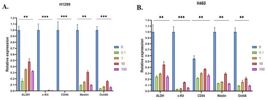 The impact of 20E on markers of NSCLC CSCs was determined in two ways. At first, cells were treated with 0, 0.1, 1, 10, and 100 µM 20E for 48 h followed by the analysis of gene expression using Real-Time PCR.