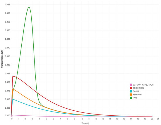 The first simulation was run under the “initial conditions” scenario (Table 1). This simulation tested the intracellular production of the chemical species of interest (data available in Mendeley Data, https://doi.org/10.17632/2xzzkmnpfx.1). In this simulation, increasing concentrations of QS signal molecules were not considered because the purpose was to assess the basal capacity of the model to reproduce the QS circuits and produce QS signal molecules intracellularly. In silico intracellular production of the chemical species of interest corresponded to simulated concentrations of 0.0234 μM for 3O-C12-HSL, 0.0102 μM for C4-HSL, 0.00099 μM for PQS; 0.0158 μM for ferribactin, and 0.0635 μM for PVD (Figure 3). These values are relevant because they test whether the model behaves in agreement with data reported in the literature [56,57,58].