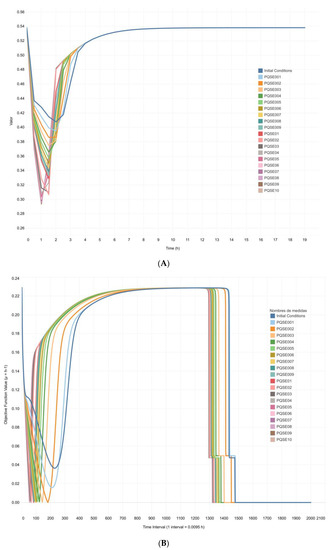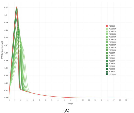 On the other hand, it should be noted that the simulated extracellular PVD (Figure 4B) behaved differently from intracellular PVD in response to the increase of extracellular PQS levels. In the first few hours, the system showed a change in the trajectory of the extracellular PVD concentration. This different dynamic response could be attributed to the PVD transport mechanism involving the surface receptor FpvA, the anti-sigma factor FpvR [66,67], and the protein responsible for energy transduction to import molecules through the TonB protein located in the outer membrane of the bacterium [7,8,14,15,67,68,69]. According to Arevalo-Ferro et al., the expression of TonB is also regulated by QS in P. aeruginosa [70]. Thus, the results of simulations performed with the QS Network can be supported, as mentioned previously, on the basis that any system in dynamic equilibrium tends to reach a stable state, which translates into an equilibrium that resists external forces of change.