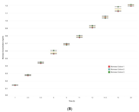 In addition, biomass profiles and concentrations of metabolites of interest were obtained under the DFBA approximation. Both in silico (Figure 7A) and in vitro (Figure 7B) data showed an exponential increase in biomass profiles up to hour 14 of culture of P. aeruginosa. A similar exponential increasing trend in biomass concentration was also observed over time up to the stationary phase. Therefore, it is possible to suggest that the biomass profile predicted (Figure 7A) by the CCBM1146 model properly represents the in vitro behavior of P. aeruginosa (Figure 7B).