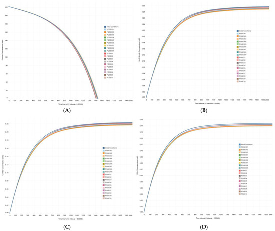 In silico, glucose concentration varied over time in all simulation conditions (Figure 9A); the initial glucose concentration (55 mM) was consumed entirely at approximately 14 h. In addition, in silico profiles of the QS signal molecules, i.e., 3O-C12-HSL (Figure 9B), C4-HSL (Figure 9C), and PQS (Figure 9D), also showed their concentrations increased up to hour 10. This time roughly corresponded to the mid-exponential phase of P. aeruginosa growth in vitro and agreed with data from the literature, according to which cells have a basal production of signal molecules that reach a maximum concentration in the mid-exponential phase of growth.