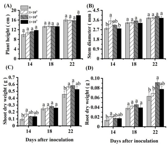 Inoculation with an appropriate concentration of NRCB010 increased the tomato biomass (Figure 1). Compared with control, the shoot and root dry weight of the tomato significantly increased by 27.7% and 45.2%, respectively, at 22 DAI with 105 CFU mL−1 NRCB010 (Figure 1C,D). Within 22 DAI, the plant height and stem diameter did not significantly change (Figure 1A,B).