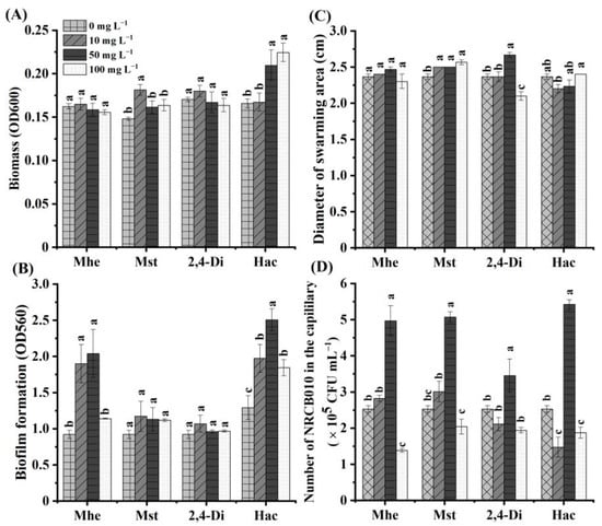 Effects of four tomato root exudate metabolites on Pseudomonas stutzeri NRCB010. (A) Biomass (n = 8), (B) biofilm formation (n = 8), (C) diameter of swarming area (n = 3), and (D) chemotaxis (n = 3). Bars are means ± standard error. Different letters above the bars at the same metabolite denote significant differences between concentrations by Duncan’s post hoc test (p < 0.05). Mhe presents methyl hexadecanoate; Mst presents methyl stearate; 2,4-Di presents 2,4-di-tert-butylphenol; and Hac presents n-hexadecanoic acid.