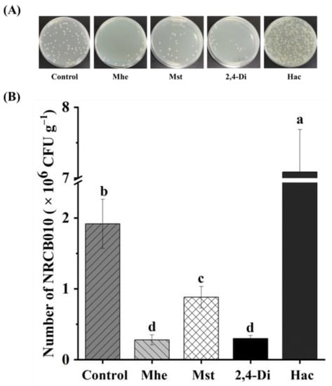 Effects of four tomato root exudate metabolites on Pseudomonas stutzeri NRCB010 colonization on tomato root surface. (A) Representative image of CFUs on spread plate. (B) Number of NRCB010 colonized on root surface. Bars are means ± standard error (n = 3). Different letter above the bars denotes significant differences between metabolites by Duncan’s post hoc test (p < 0.05). Mhe presents methyl hexadecanoate; Mst presents methyl stearate; 2,4-Di presents 2,4-di-tert-butylphenol; and Hac presents n-hexadecanoic acid.