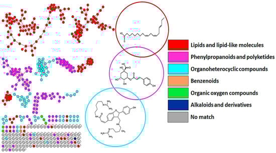 For metabolome characterisation, a molecular networking (MN) strategy, i.e., MolNetEnhancer, was applied (as described in the methodology section). This allowed a comprehensive exploration and enrichment of chemical annotations, discovering the subtle substructural diversity within molecular families. Furthermore, this MN strategy allowed the visualisation of molecular families with class annotations. Six molecular families were visualised and highlighted in Figure 2. These were lipids and lipid-like molecules, phenylpropanoids and polyketides, organoheterocyclic compounds, benzenoids, organic oxygen compounds, and alkaloids and derivatives. When zooming into these superfamilies, the phenylpropanoids and polyketide superfamily was dominated mainly by flavonoid glycosides. These superfamilies of metabolites served as a template for the annotation of the discriminant metabolites.