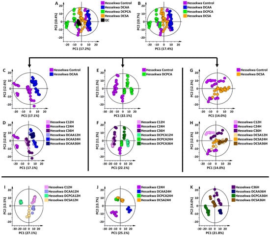 Principal component analysis (PCA) score plots of ESI(–) data from shoot extracts of the ’Hessekwa’ cultivar of Hordeum vulgare. All data were UV (unit variance) scaled, and the calculated Hoteling’s T2 with a 95% confidence interval is represented by the ellipses present in each PCA score plot. (A): a 12-component model of all conditions (including quality controls, QCs), explaining 59.5% variation and predicting 41.6% variation; (B) a 12-component model of all conditions (excluding QCs) explaining 60.7% variation, and predicting 42.2% variation. (C): a 6-component model of 3,5-DCAA treated and non-treated samples at 12, 24, and 36 h, respectively, explaining 54.6% variation and predicting 37.2% variation; (D): same as (C) but coloured based on time points; (E): a 7-component model of 2,6-DCPCA treated and non-treated samples, explaining 60.6% variation and predicting 41.1% variation; (F): same as (E) but coloured based on time points. (G): a 7-component model of 3,5-DCSA treated and non-treated sample, explaining 53.8% variation and predicting 29.9% variation; (H): same as (G) but coloured based on time points. (I): a 4-component model of all treated and non-treated samples at 12 h, explaining 56.5% variation, and predicting 41.7% variation; (J): a 4-component model of all treated and non-treated samples at 24 h, explaining 54.4% variation, and predicting 35.5% variation; (K): a 4-component model of all treated and non-treated samples at 36 h, explaining 50.1% variation, and predicting 33.2% variation. (The corresponding set of diagrams for ESI (+) data is presented in Figure S4). As observed in (A,B), (C–H) were generated to better visualise the time-dependent changes in each treatment, while (I–K) highlight the treatment-dependent variation at each selected time point.