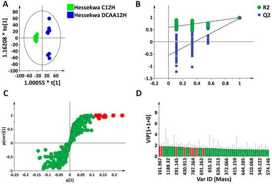 Supervised learning methods for analyses of ultra-high performance liquid chromatography–mass spectrometry (UHPLC–MS) data. Orthogonal partial least squares discriminant analysis (OPLS-DA) modelling and feature selection were performed based on the unique metabolite profiles of ‘Hessekwa C12h’ (control at 12 h) and ‘Hessekwa DCAA 12 h’ (treatment at 12 h) leaf extracts in negative ionisation mode. (A) OPLS-DA score plots show a clear separation between the two conditions. The model is made of one predictive component and one orthogonal component (R2X = 57.5%, R2Y = 98.9%, Q2 = 96.1%, CV-ANOVA p-value= 4.6539 × 10−9). (B) OPLS-DA validation: Permutation test analysis performed with 100 randomly selected models and showing the above model to be the best among the permutated ones. (C) Loading S-plots showing the features responsible for sample clustering, located at the ‘outlier’ ends of the S-plots with both high correlation and covariation, [p(corr) ≥ 0.75 and (p1) ≥ 0.1], are highlighted in red. These features are statistically significant candidates as biomarkers related to the DCAA treatment. (D) A variable importance in projection (VIP) plot corresponding to the model above and pointing out the mathematical significance of each feature responsible for the discrimination of the treated vs. control conditions. A VIP score >1 is considered as significant in the projection, and the higher the score values, the more significant the features are.