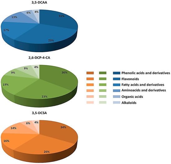 As discussed above, common and specific responses were observed, featuring fluctuations in metabolites grouped as phenolic acids and derivatives, flavonoids, fatty acids and derivatives, amino acids, organic acids, and alkaloids, listed in descending percentage order across all treatments (Figure 7). These classes belonged to the superfamilies identified on the MolNetEnhancer network (Figure 2). While nuanced differences in the % values were noted between the three treatments, the overall patterns were similar, suggesting that the three dichlorinated inducers (3,5-DCAA, 2,6-DCP-4-CA, and 3,5-DCSA) trigger the same type of response in the barley leaves.
