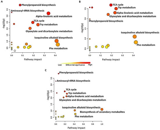 Metabolomic Pathway Analysis (MetPA) as generated by MetaboAnalyst ver. 5.0 with (A): 3,5-DCAA, (B): 2,6-DCP-4-CA, and (C): 3,5-DCSA data. The size of the circle reflects the pathway impact score, while the colour of each circle is based on p-values (darker colours imply more significant changes of metabolites in the relevant pathway). TCA: tricarboxylic acid; Trp: tryptophan; Phe: phenylalanine.