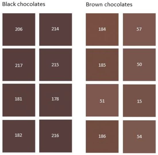 All participants in the sensory analysis classified eight samples (codes 184, 185, 186, 15, 50, 51, 54, and 57) as brown chocolates (Table S2). Therefore, these samples were selected to form the group of brown chocolates. Similarly, eight samples (codes 216, 214, 217, 206, 178, 215, 181, and 182) were retained to build the black chocolate group. Indeed, these samples received the votes of all participants, except for sample 182 which received 5 out of 6 votes (Table S2). The fact that the selected chocolates received the votes of at least 5 evaluators demonstrates confidence in the brown and black chocolate groups that were obtained. The rest of the chocolate samples were classified having an intermediate color and were eliminated from the further stages of the study. Figure 2 shows the reconstituted colors of the black and brown chocolate groups selected by the evaluators.