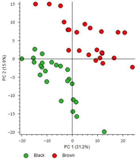 Figure 3. Score plot of principal component analysis from the UHPLC−HRMS features of the black and brown chocolates.