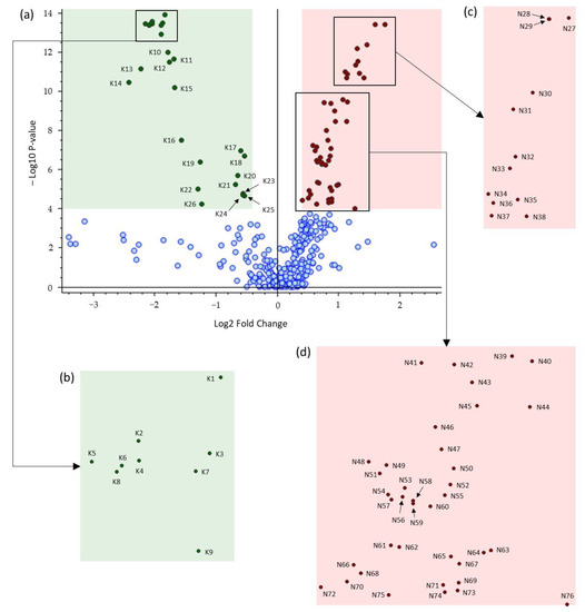 Features above and under the threshold of −log10 p-value = 4 on the ordinate axis corresponding to a p-value of 0.0001 were qualified as highly and non-highly discriminant features, respectively (Figure 4a). Therefore, the pink shaded region on the right of Figure 4a contains the most discriminating overaccumulated features for brown chocolates (50 metabolites coded from N27 to N76) and the green shaded region on the left contains the most discriminating overaccumulated features for black chocolates (26 metabolites coded as K1–K26).