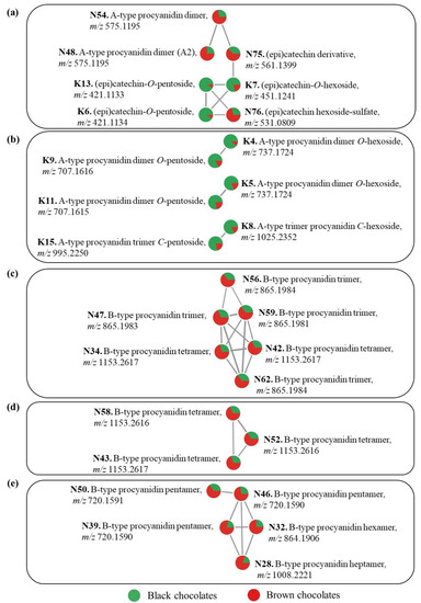 Similarly, pentameric (N46, N31, N36, N39, N40, and N50), hexameric (N30, N32, N33, and N38), and heptameric (N28) B-type procyanidins were tentatively identified. Their HRMS/MS spectral data are in accordance with the literature for chocolate [8,18,25]. Furthermore, some of these compounds (N39, N50, N46, N32, and N28) were connected in the same molecular network (Figure 5e), which facilitated their chemical annotations. The figure also shows the greater relative abundance of these compounds in brown chocolates.