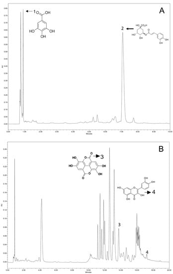 Identified phenolic compounds chromatograms in the lyophilized P. aculeate leaves extracted with ethanol (50%) and ultrasound for 20 min (EO20). (A): spectrum of standard pattern diluted in water; 1: gallic acid; 2: chlorogenic acid; (B): spectrum of standard pattern diluted in methanol; 3: ellagic acid; 4: quercetin.