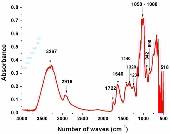 The peak at the 890 cm−1 wave number was identified as characteristic of polysaccharide structures that originated from β-glycosidic bonds between the sugar units. Furthermore, 518 and 942 cm−1 bands can be associated with pectins and lignins [57,58]. Finally, the presence of functional carboxyl groups and proteins in the region the between 1000 and 1500 cm−1 bands [54,58,59] in P. aculeate leaves is evidence of the favoring interaction with water, contributing to crucial characteristics for colloid obtaining, such as gel formation.