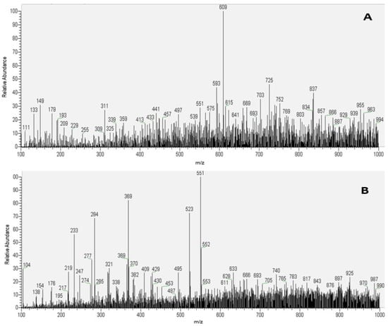 Paper spray mass spectra representation. (A) PS-MS spectrogram in negative ionization mode and (B) PS-MS spectrogram in positive ionization mode of the lyophilized P. aculeate leaves extract extracted with ethanol (50%) by ultrasound for 20 min (EO20).