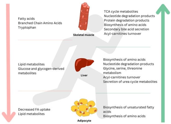 Additionally, accelerated fat metabolism was observed in a number of studies, with significant changes across all forms: long-chain, medium-chain, branched-chain, am-ino-FAs (amino-fatty acids), carnitines, ketones, lipid mediators, membrane lipids, and fatty acid esters of hydroxy fatty acids (FAHFAs) [2,4,20,27,35,36,42,45,47,48,49]. Studies also highlighted ketone body accumulation following exercise, suggesting a switch from glycolytic metabolism to ketolytic metabolism during acute endurance exercise [2,27,35,45,48]. The primary ketone bodies acetoacetate and β-hydroxybutyrate increased in response to acute endurance exercise [27,35,45] but not to resistance exercise [27]. A possible reason for this difference could be the higher caloric expenditure needed for acute endurance exercise, which leads to an energy demand exceeding intracellular supplies, resulting in ketone bodies being delivered from hepatocytes. Alterations in steroid metabolism were also observed [20,27,42]. Zhao et al., found steroid metabolism to downregulate after exercise and upregulate after recovery, while the metabolites related to lipid transport and metabolism were significantly perturbed during exercise and recovery. Pinto et al. noted a decrease in cortisol following acute endurance exercise as well as an increase in testosterone, dehydroepiandrosterone (DHEA), estrone, and 17-OH-progesterone. Testosterone was shown to increase muscle mass and strength [50], while estrogen decreased bone resorption and muscle damage [51]. Nemkov et al., additionally observed an overall decrease in RBC lipid levels, indicating the activation of the membrane lipid remodeling pathways [52]. Interestingly, Varga et al., noted a blunted metabolomic response in the lipid profiles of female athletes with Relative Energy Deficiency in Sport (RED-S) syndrome, which is often caused by overtraining and inadequate nutrition [47]. Athletes with RED-S showed a significantly smaller increase in phosphatidylethanolamines levels and a markedly different trajectory of triglyceride levels than athletes with sufficient energy availability, indicating that overtraining likely hinders the adaptive metabolic response to exercise interventions.