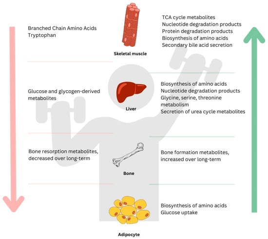 A general summary of metabolites induced by a bout of resistance exercise in different tissues: skeletal muscle, liver, adipocyte, and bone. Downward arrow on the left (↓) shows metabolites that decreased in response to exercise; upward arrow on the right (↑) indicates metabolites that increased in response to exercise.